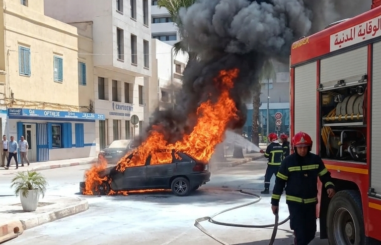 بالصور.. احتراق سيارة وسط مدينة الناظور واستنفار الوقاية المدنية دون خسائر بشرية