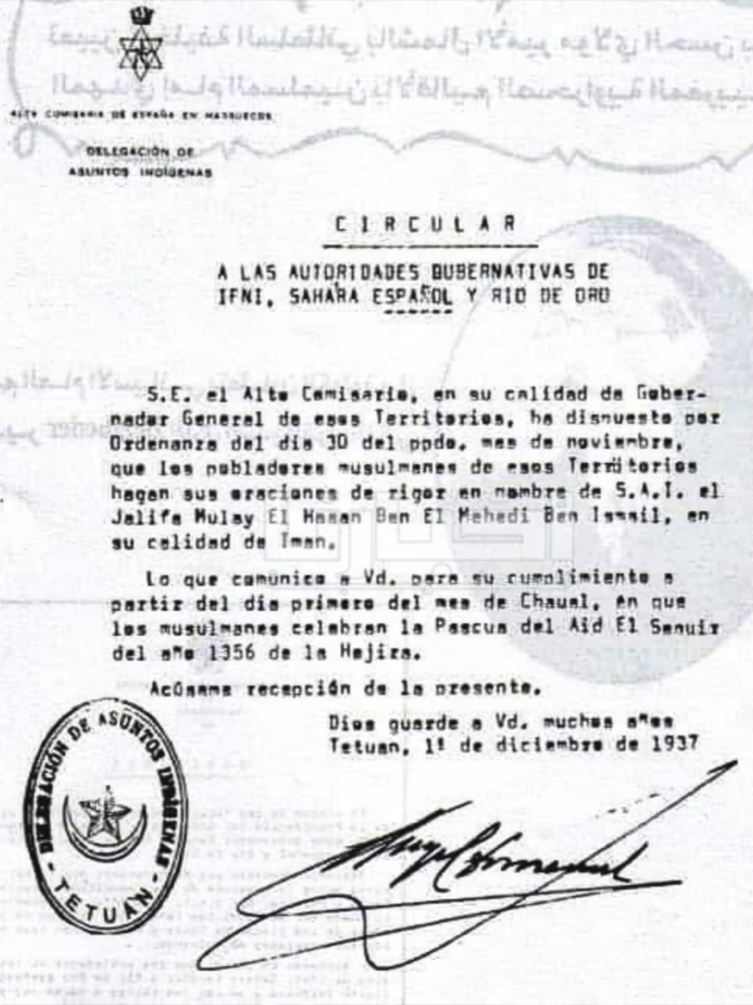الوثيقة، الصادرة بمدينة تطوان بتاريخ فاتح دجنبر 1937، تتضمن توجيهات رسمية من سلطات الحماية الإسبانية إلى ممثليها المحليين بكل من سيدي إفني ومنطقتي الساقية الحمراء ووادي الذهب، تقضي بإقامة صلاة عيد الفطر لسنة 1356 هجرية مع الدعاء باسم خليفة السلطان بالمنطقة الخليفية وعاصمتها تطوان، وهو مولاي الحسن بن المهدي بن إسماعيل.