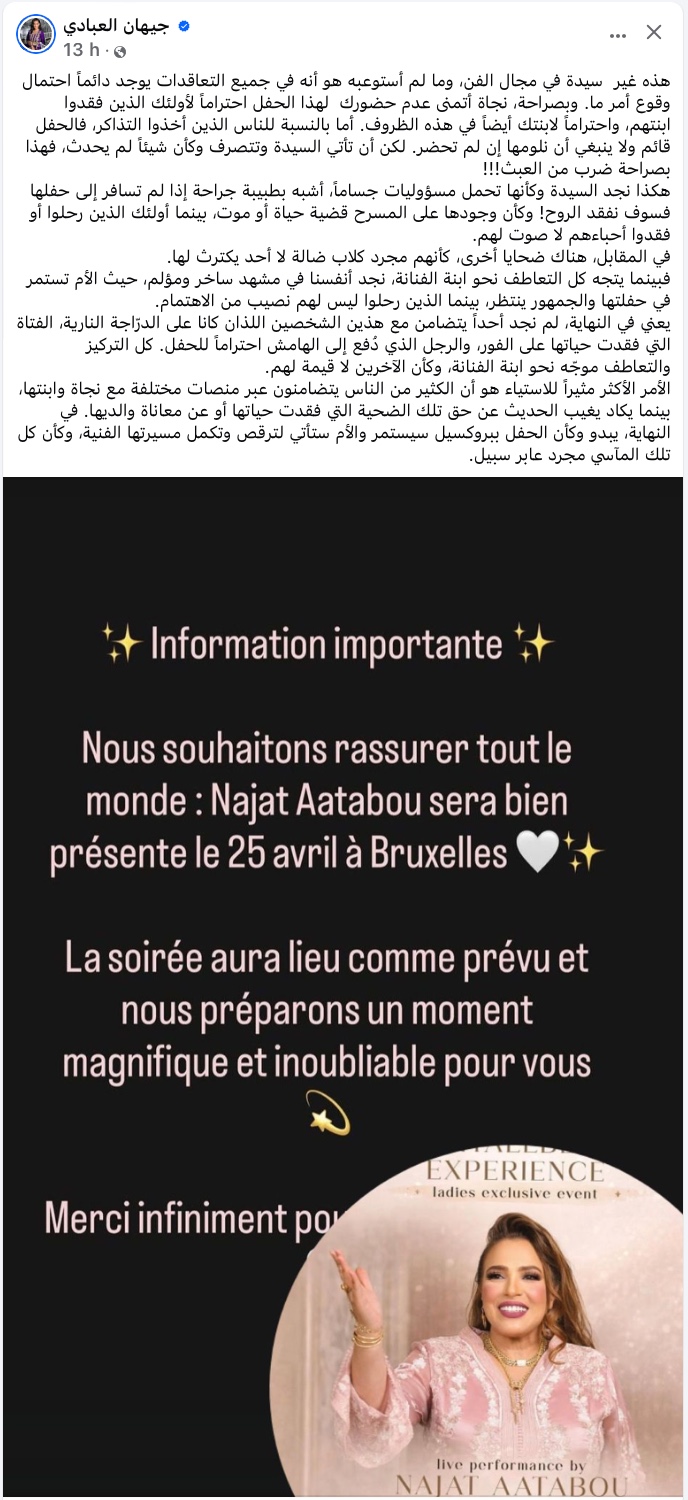 في هذا السياق، برزت تدوينة لافتة للإعلامية المغربية “جيهان العبادي” المقيمة في بلجيكا، والتي أثارت تفاعلاً واسعاً على منصات التواصل الاجتماعي، بعد أن قالت: “هذه غير سيدة في مجال الفن، وما لم أستوعبه هو أنه في جميع التعاقدات يوجد دائماً احتمال وقوع أمر ما”، وأضافت: “وبصراحة، نجاة أتمنى عدم حضورك لهذا الحفل احتراماً لأولئك الذين فقدوا ابنتهم، واحتراماً لابنتك أيضاً في هذه الظروف.”